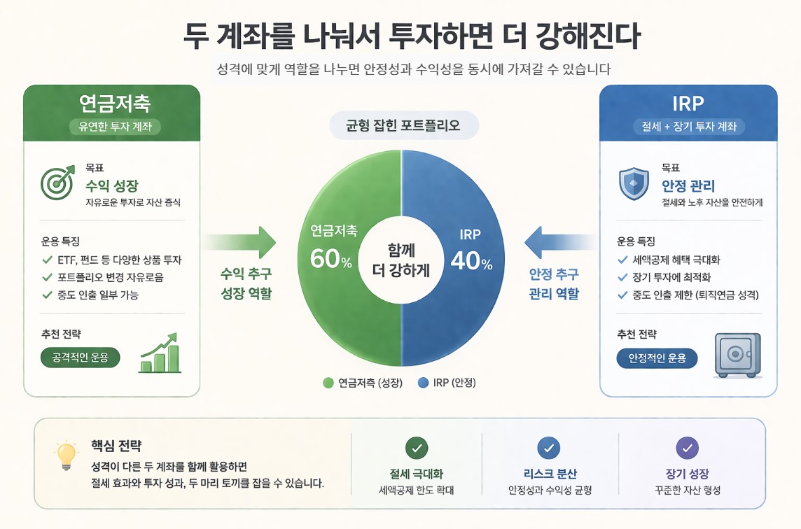연금저축과 IRP는 비교 대상이 아니다. 각각의 역할을 이해하고 함께 사용하는 것이 가장 효율적인 방법이다.